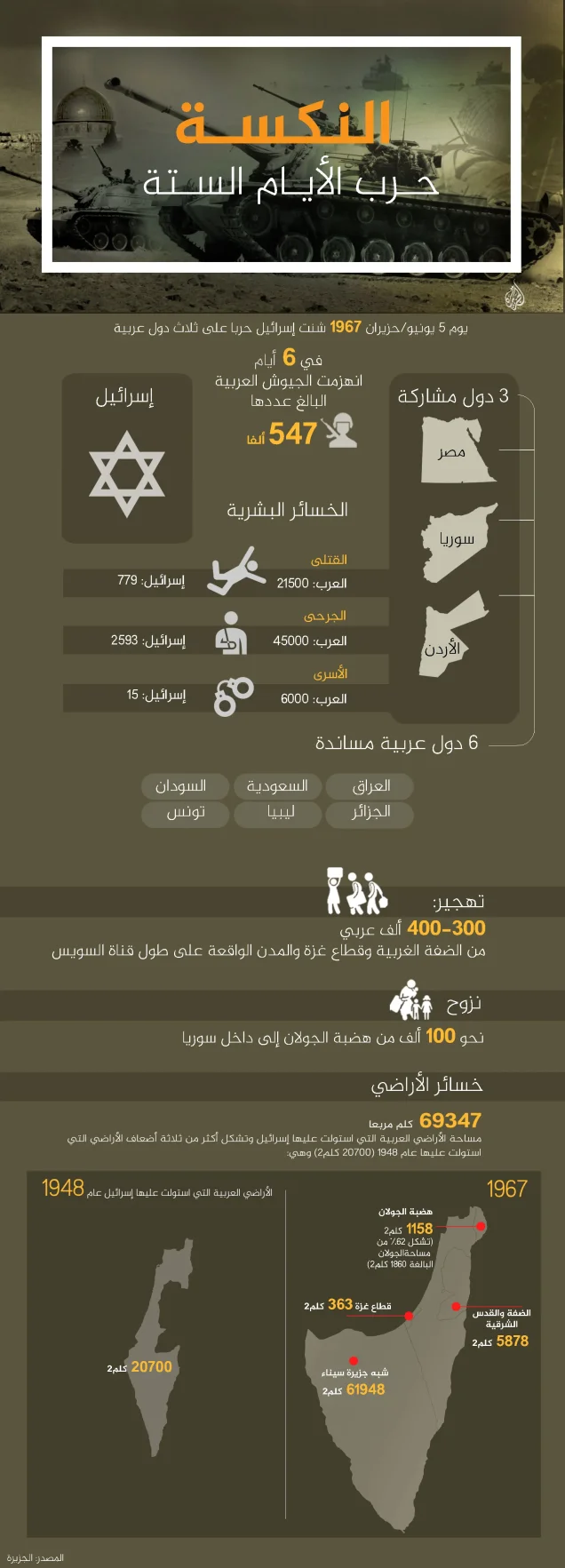 اندلعت حرب النكسة في 5 / 06 / 1967 بين الكيان الصهيوني وكلٍّ من مصر وسوريا والأردن، واستمرت حتى 10 / 06 / 1967. وخلال ستة أيام فقط، شنت إسرائيل عدوانًا خاطفًا ومدروسًا، انتهى بسيطرتها على ما تبقى من أرض فلسطين التاريخية، إلى جانب أراضٍ عربية أخرى. ففي هذه الحرب، احتلت إسرائيل: